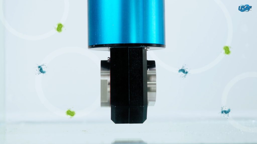 USAF is ontwikkeld om algen, biofilm en pathogenen in het water te bestrijden. Onze ultrasone zenders versturen hoogfrequente geluidsgolven die cavitatie in het water veroorzaken. Tijdens dit proces ontstaan minuscule gasbelletjes tussen de watermoleculen, die bij implosie micro-organismen vernietigen.